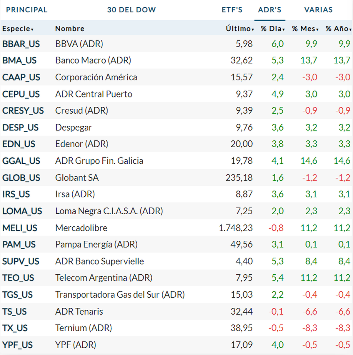 En cuanto a las acciones argentinas que se negocian en Wall Street, se muestran en su mayoría en territorio positivo. Las que experimentan las mayores subidas son BBVA (+6%), Banco Supervielle (+5,7%), Telecom (+5,4%) y Banco Macro (+5,3%). Por otro lado, las que presentan las únicas caídas son MercadoLibre (-0,8%) y Ternium (-0,5%)