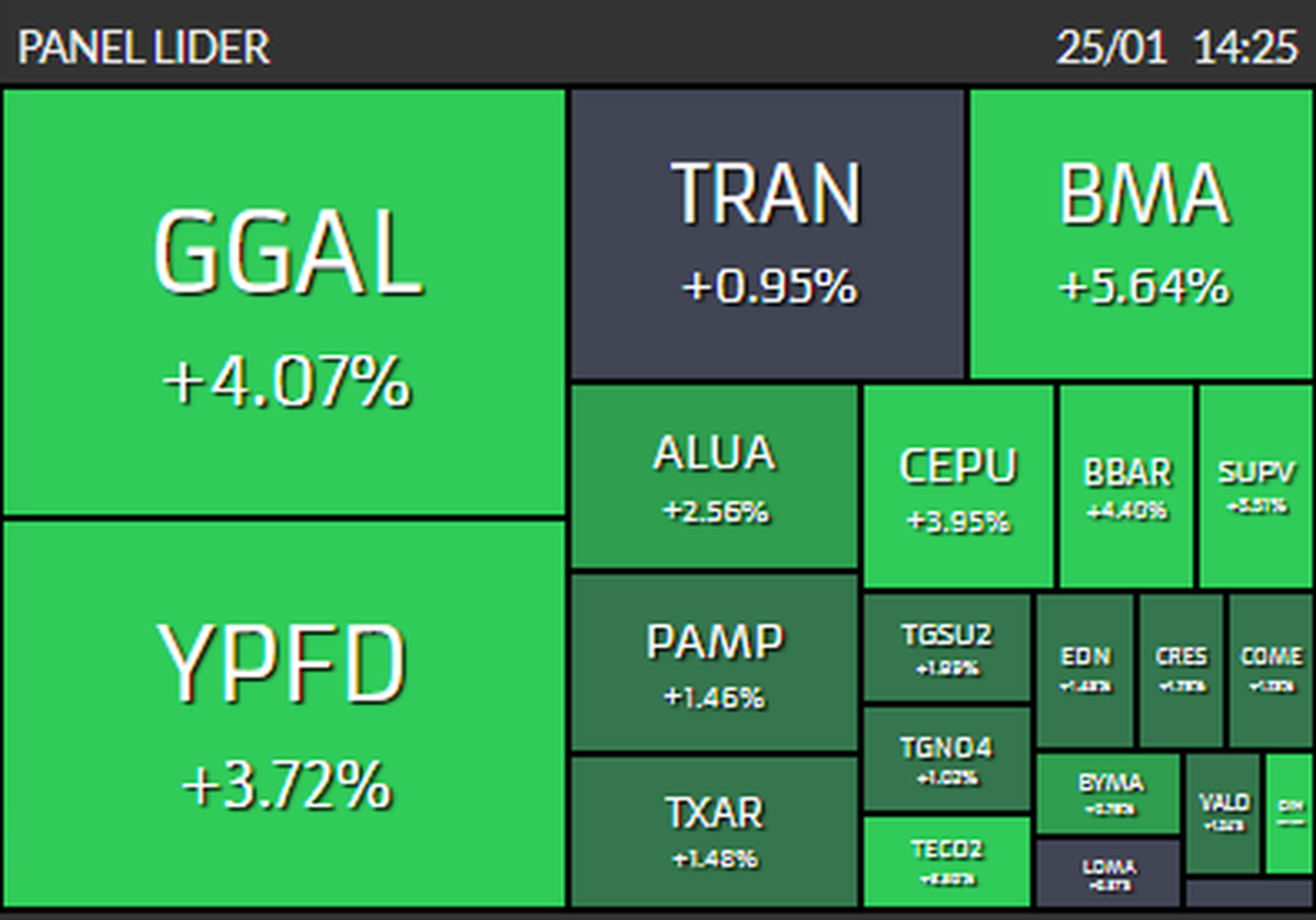 Las acciones del panel líder que obtienen las mayores ganancias son GGAL (+4,07%), Banco Macro (+5,64%), BBAR (4,4%).