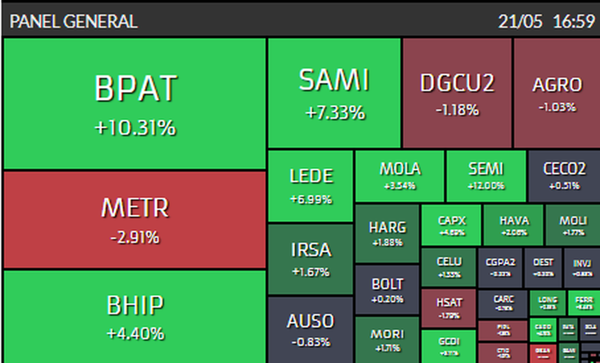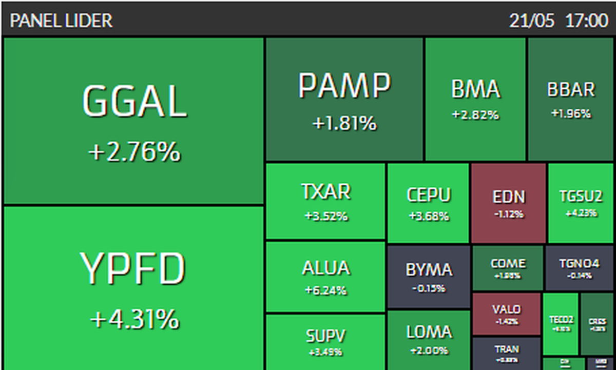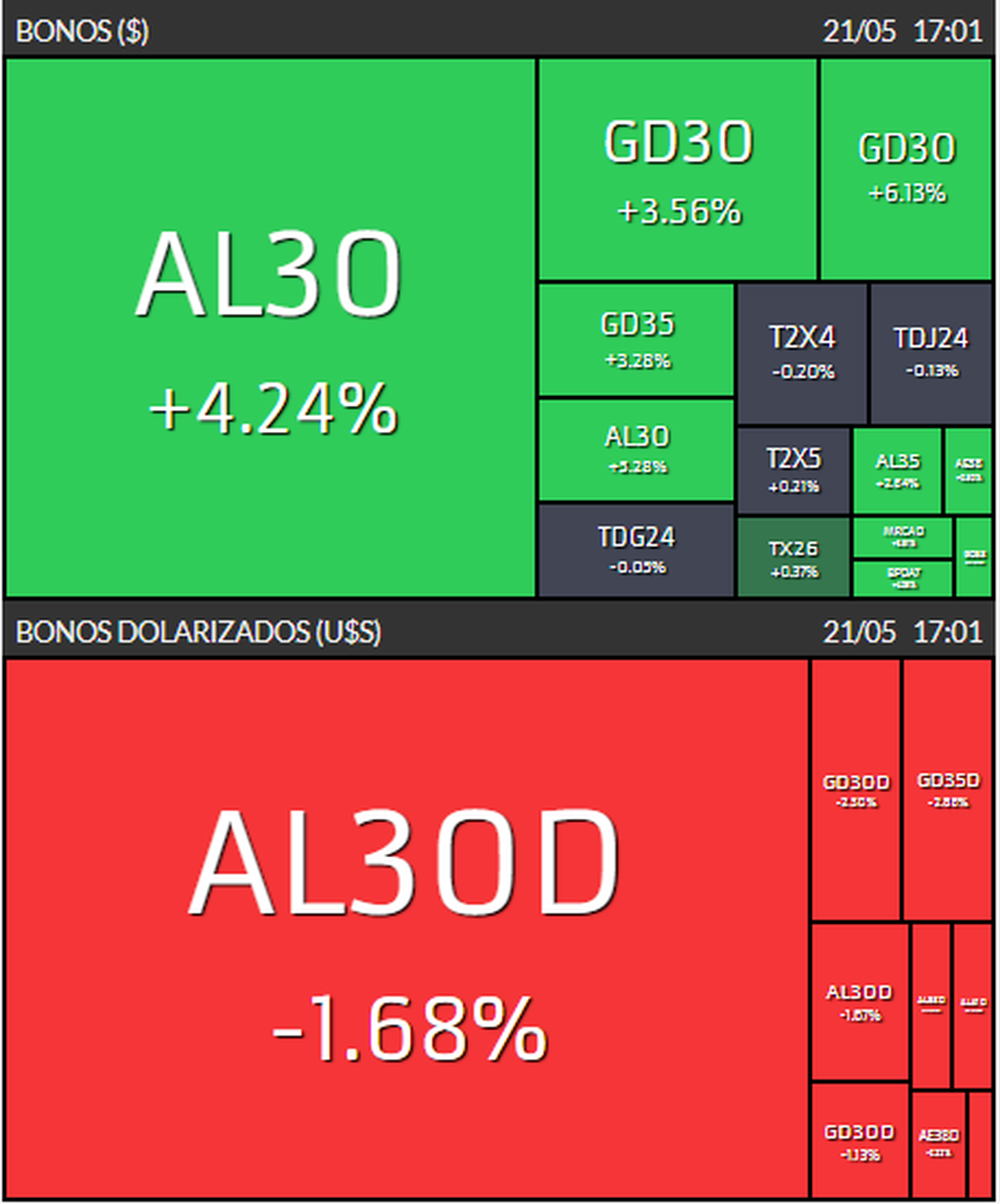 Este martes 21 de mayo, el índice S&P Merval registra una jornada positiva en pesos pero negativa en dólares. A su vez, los bonos en dólares presentan resultados negativos, a diferencia de los principales dólares financieros -dólar MEP (o bolsa) y CCL (Contado Con Liquidación) que vuelven a subir.