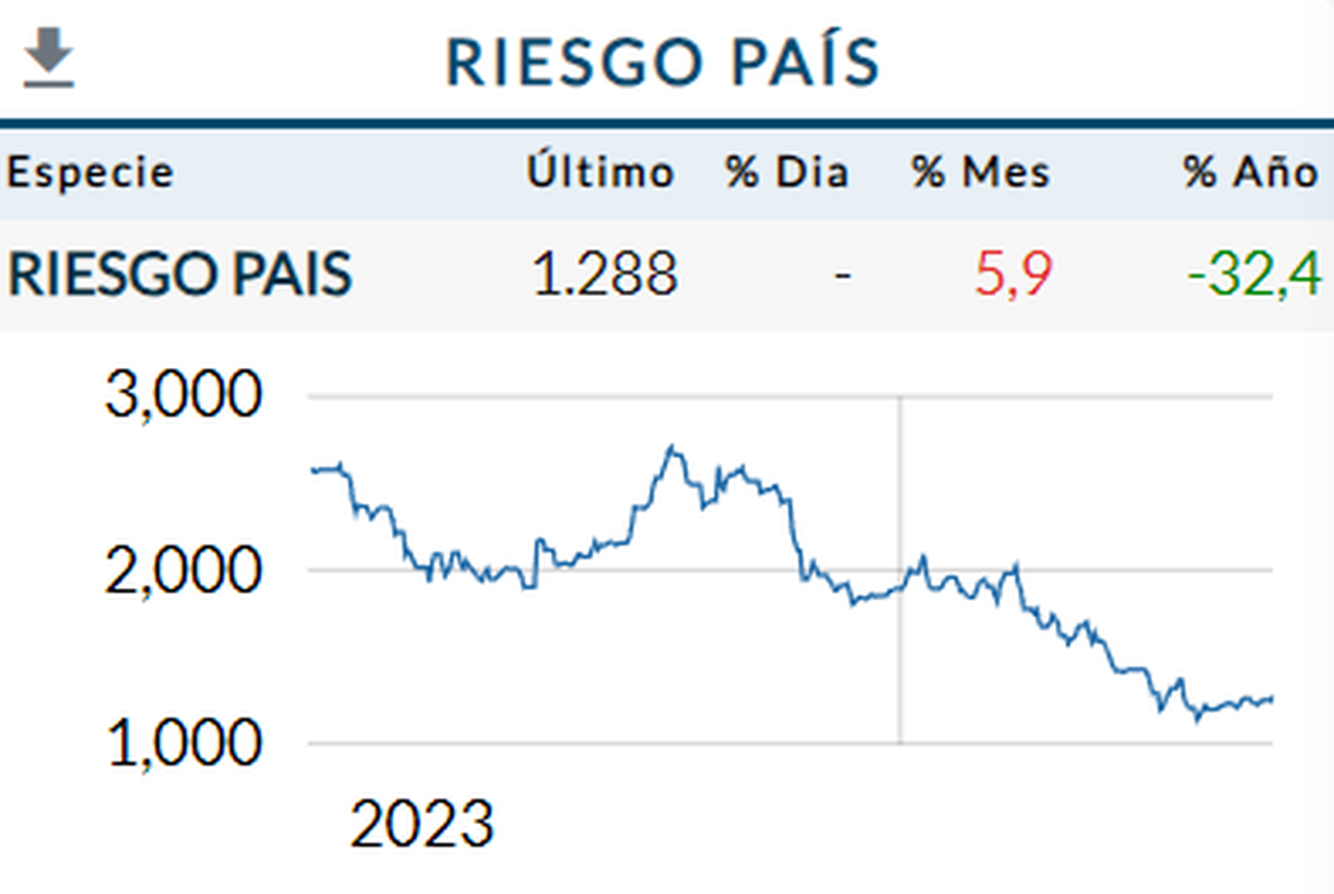 Mientras tanto, el riesgo país se ubica por encima de los 1.280 puntos a 1.288 puntos básicos.