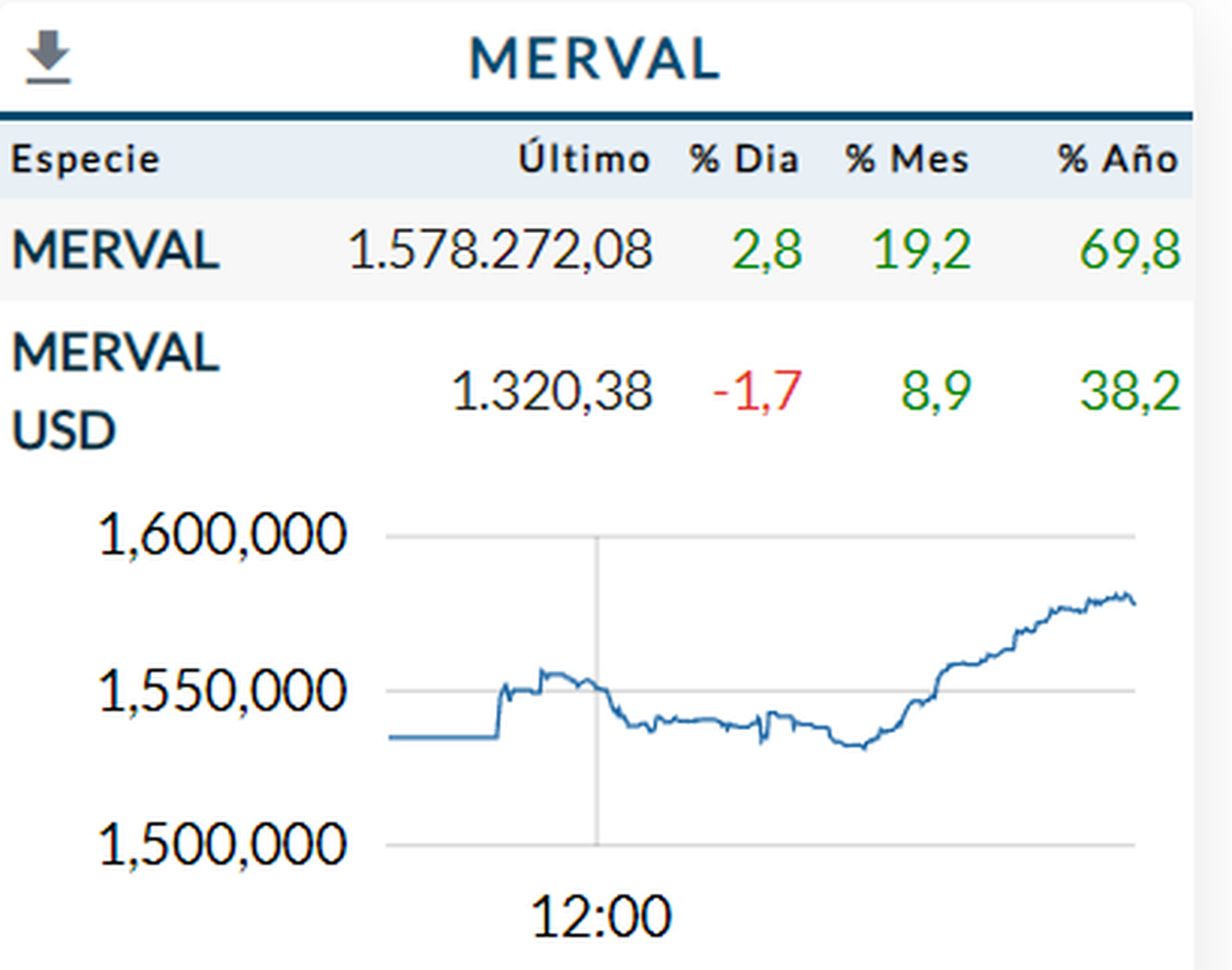 En este sentido, el principal índice porteño registra un aumento del 2,8%, a 1.578.272,08 puntos, mientras que, en dólares, cae un 1,7% a US$ 1.320,38.