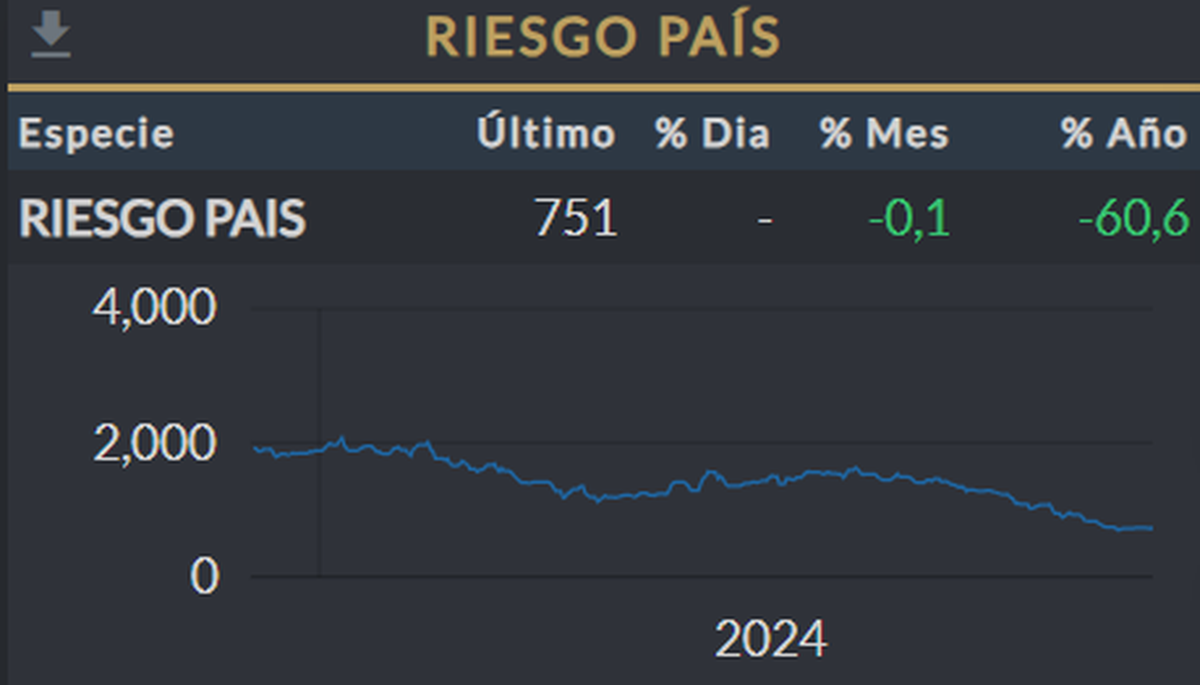 Mientras tanto, el riesgo país se ubica por debajo de los 800 puntos a 751 puntos básicos.