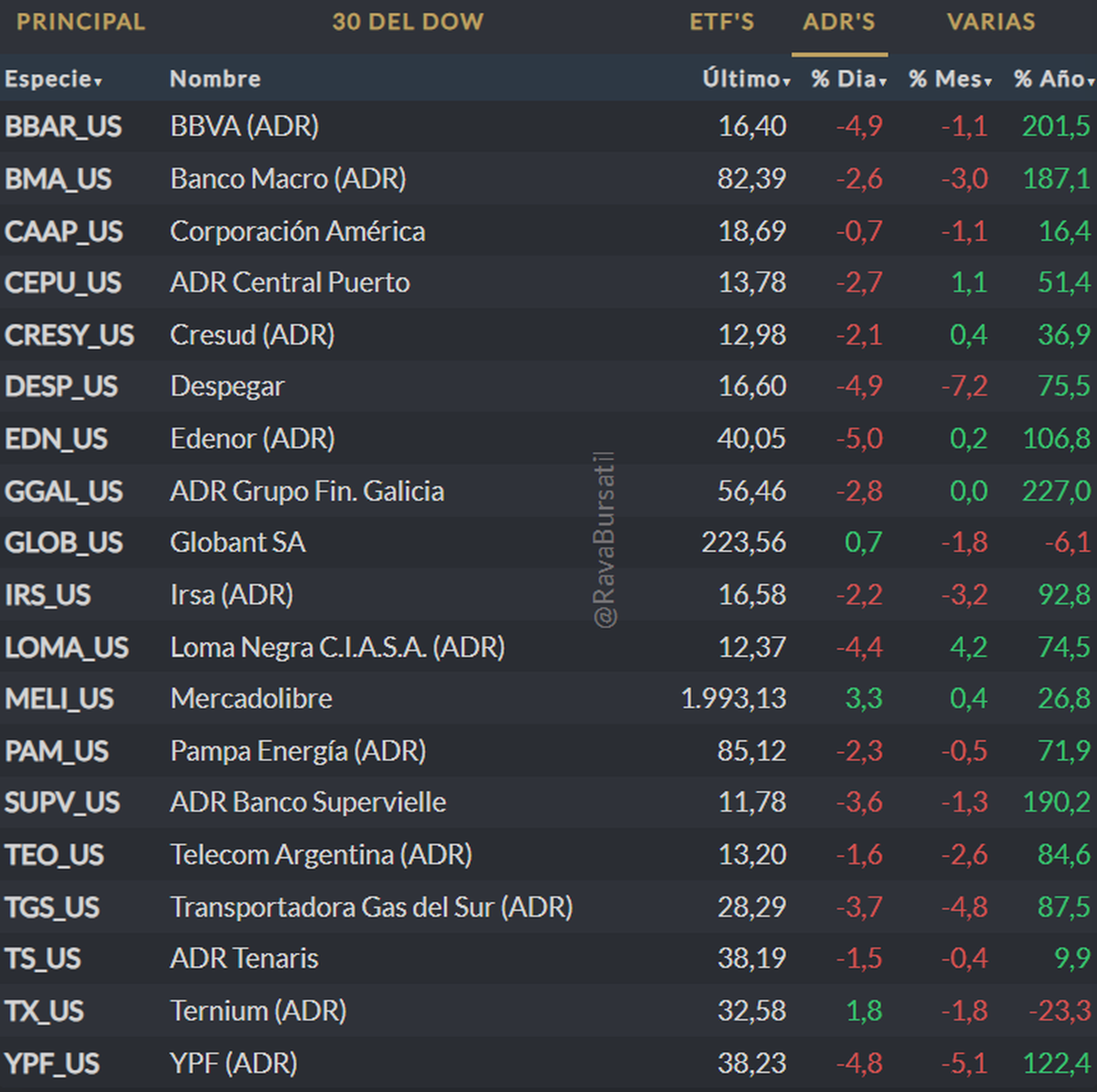 En Wall Street, la acción que protagonizó el mayor ascenso de la jornada fue MercadoLibre y lo hizo con un 3,3%, mientras que la mayor baja se la lleva Edenor al descender un 5%. Cabe mencionar que la tendencia en la jornada está siendo bastante mixta.