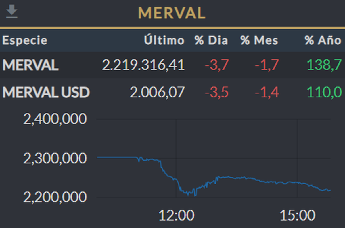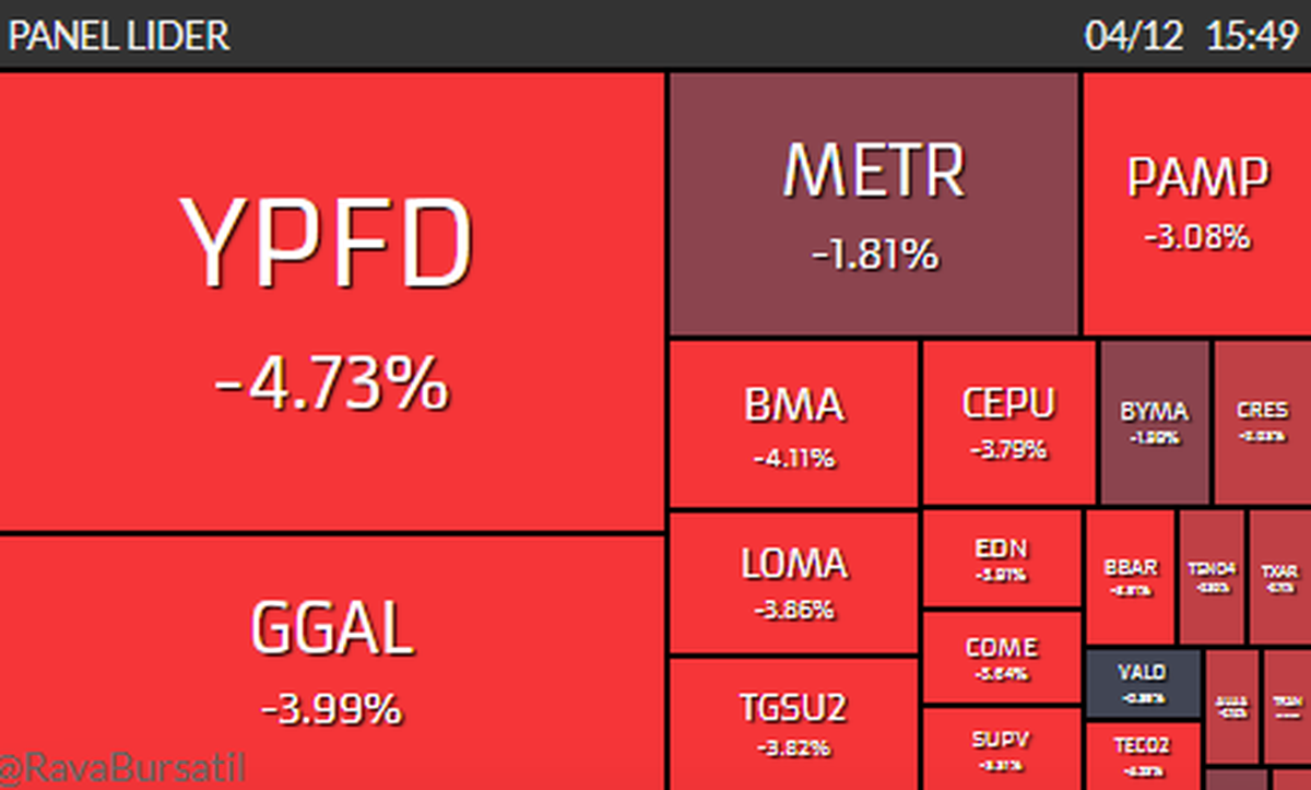 Y un día tocó, después de largas jornadas en verde, el S&P Merval sufre hoy (4/12) una caída generalizada que marca un retroceso del 3,7% en pesos y del 3,5% en dólares.