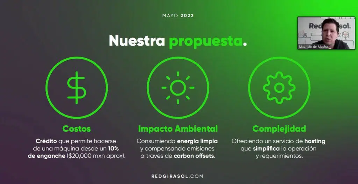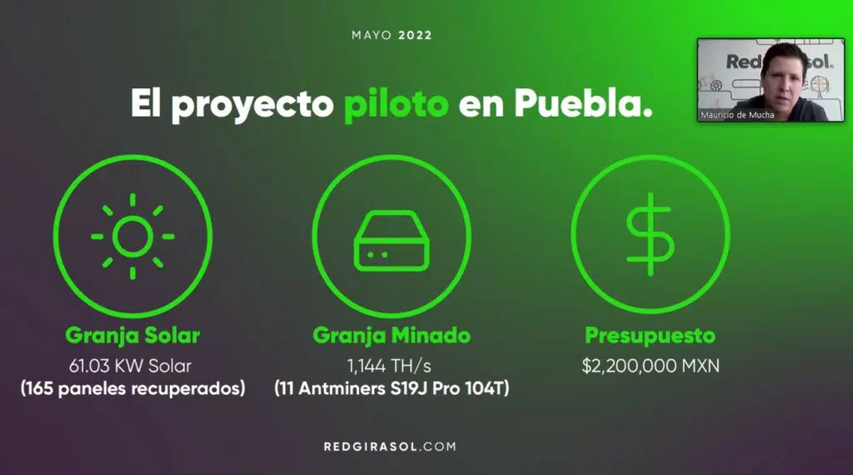 Aunque no dijo cuándo se pondrá en marcha, Mauricio de Mucha mostró el proyecto piloto de la empresa. Este consiste en la instalación de una pequeña granja minera de Bitcoin en la ciudad de Puebla, específicamente en las instalaciones de la empresa de energía solar Ergosolar.