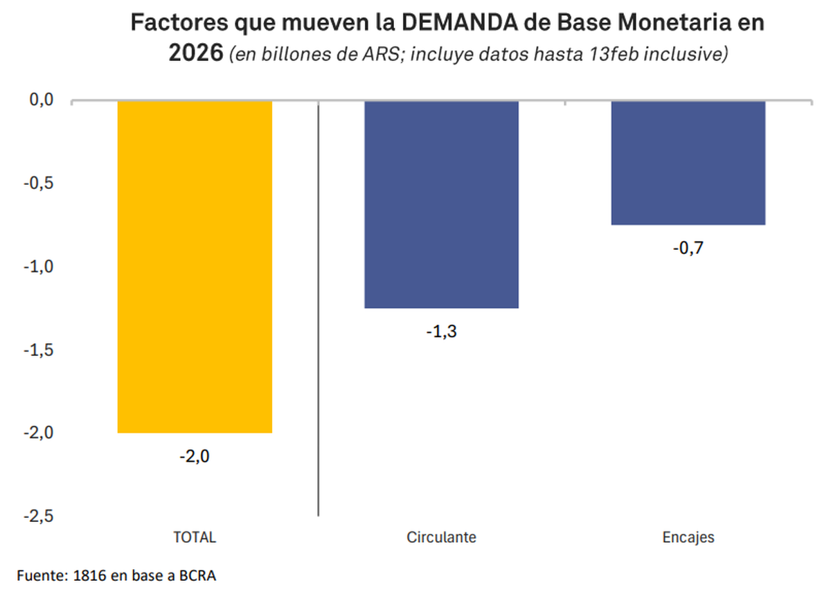 Tras la última licitación, el Tesoro terminó con financiamiento neto de $1,7 billones y, en la liquidación, la Base Monetaria cayó $1,5 billones. Según 1816, la baja se explicó por un descenso de encajes, porque los bancos ajustaron su posición en pesos para suscribir títulos del Tesoro, aprovechando un esquema más flexible con integración mínima diaria del 75% y margen para subintegrar hasta 5%.