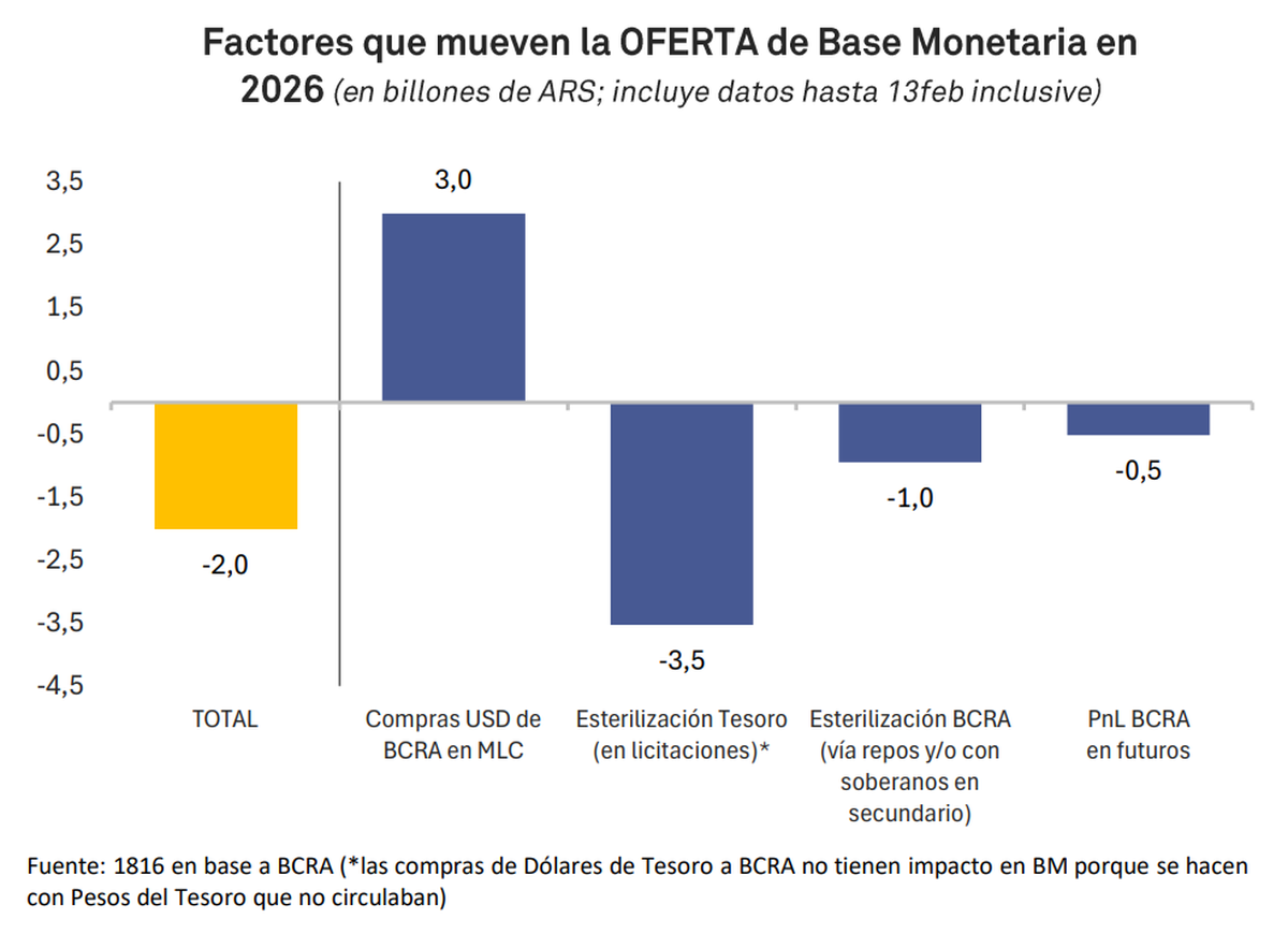 En 2026 el BCRA emitió $3,0 billones por compras de divisas, pero la base se contrajo $2,0 billones, una brecha de $5,0 billones que el informe atribuye a esterilización y resultados financieros. 1816 estima ganancia en futuros de dólar por $0,5 billones y detalla que la absorción vino por dos vías, el Tesoro aportó $3,5 billones de financiamiento neto en tres licitaciones y el BCRA sumó $1,0 billón vía repos y secundario.