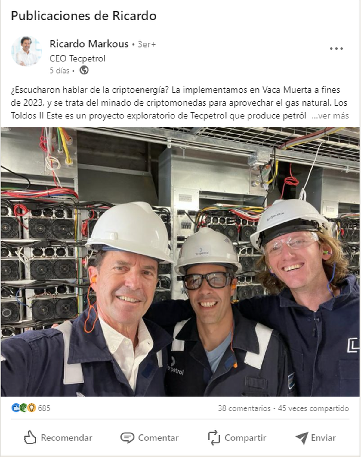 Ricardo Markous, CEO de Tecpetrol, compartió en su cuenta de Linkedin detalles sobre este proyecto exploratorio que se dedica a la producción de petróleo y que, debido a su novedad y ubicación remota, aún no está conectado a gasoductos ni cuenta con la infraestructura necesaria para el procesamiento, transporte y comercialización del gas asociado.
