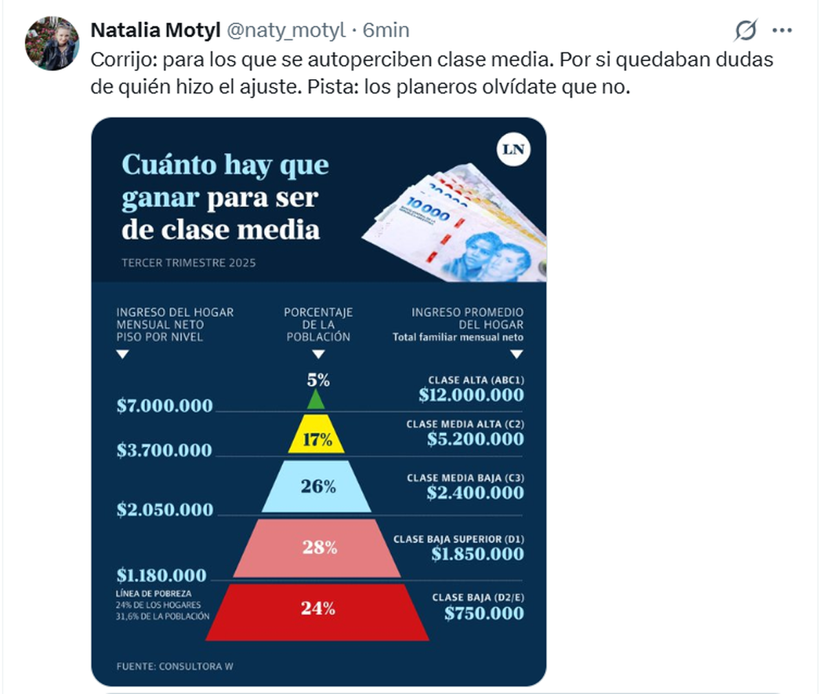 Luego, compartió un gráfico que muestra cuánto hay que ganar en la Argentina para ser considerado de clase media. Y añadió, con ironía: "para los que se autoperciben clase media. Por si quedaban dudas de quién hizo el ajuste. Pista: los planeros olvídate que no".