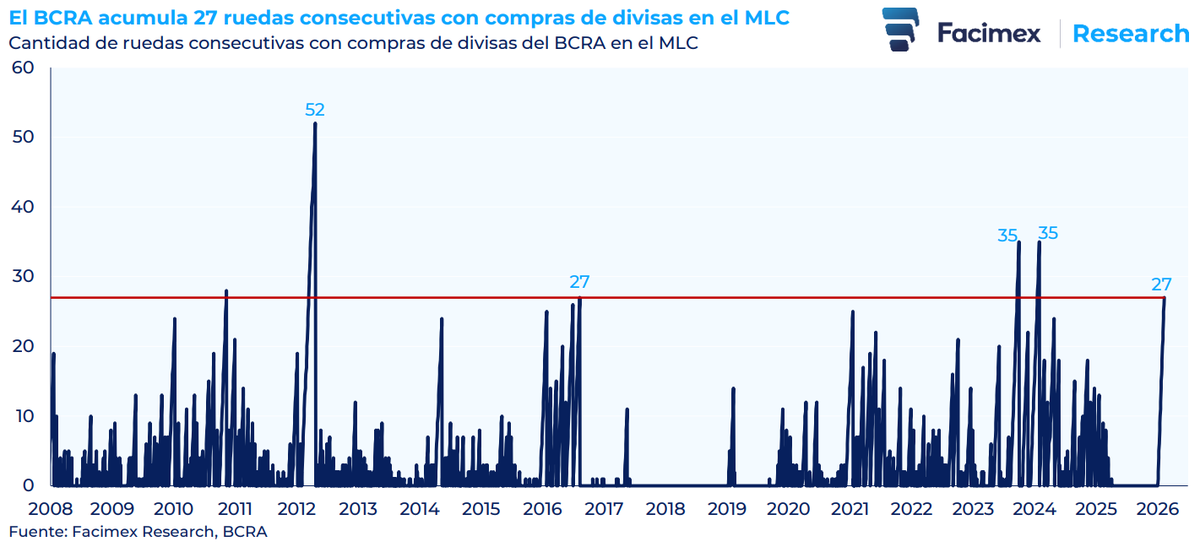 La entidad ya acumula 28 ruedas consecutivas con saldo positivo, tercera mejor marca en diez años, apenas por debajo del esquema del dólar blend 75-25 de septiembre de 2023 y del arranque de 2024 con tipo de cambio real elevado y pagos de importaciones mínimos. La diferencia ahora es que no hay un esquema transitorio de incentivo sectorial, sino un régimen de bandas que funciona con mayor previsibilidad.