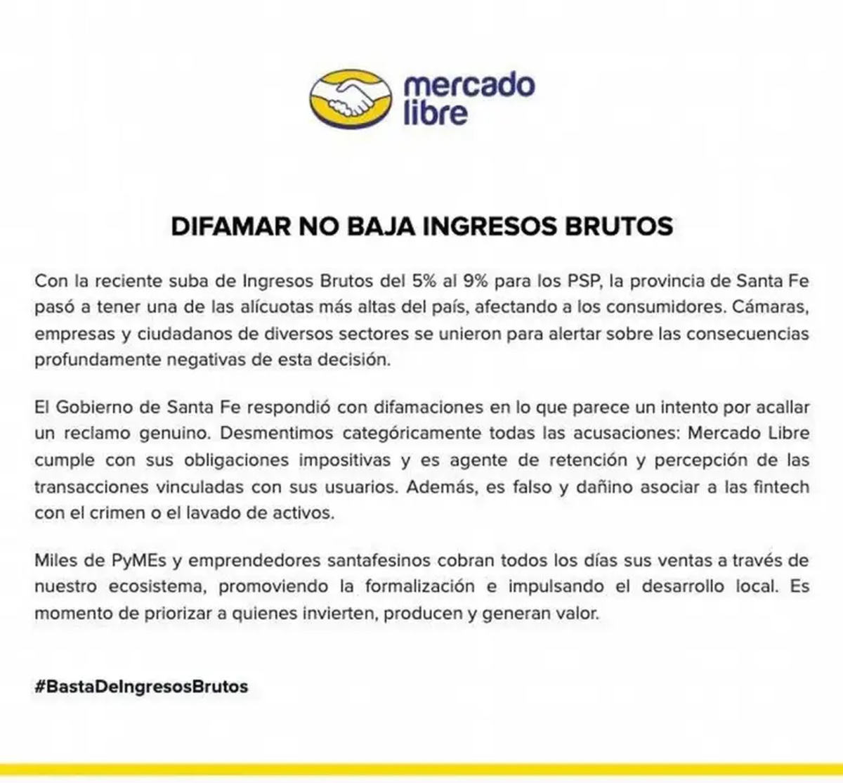 "El gobierno de Santa Fe respondió con difamaciones en lo que parece un intento por acallar un reclamo genuino. Desmentimos categóricamente todas las acusaciones: Mercado Libre cumple con sus obligaciones impositivas y es agente de retención y percepción de las transacciones vinculadas con sus usuarios. Además, es falso y dañino asociar a las fintech con el crimen o el lavado de activos", remarca el escrito.