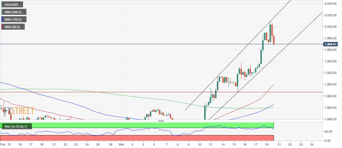 El par XAU/USD está canalizando al alza en el gráfico de 4 horas y a pesar de un retroceso en las últimas barras, es probable que continúe. El índice de fuerza relativa (RSI) parece que va a salir de la sobrecompra y si la barra de 4 horas actual termina en con un tono bajista, confirmará una señal de venta y la corrección probablemente continuará a la baja. Sin embargo, es probable que el soporte de la base del canal en torno a los US$1.950-60 proporcione un suelo para el precio del oro desde el que pueda reagruparse y montar una recuperación de nuevo dentro del canal.