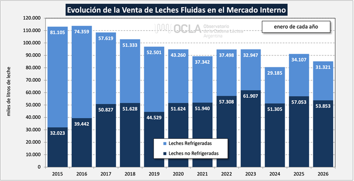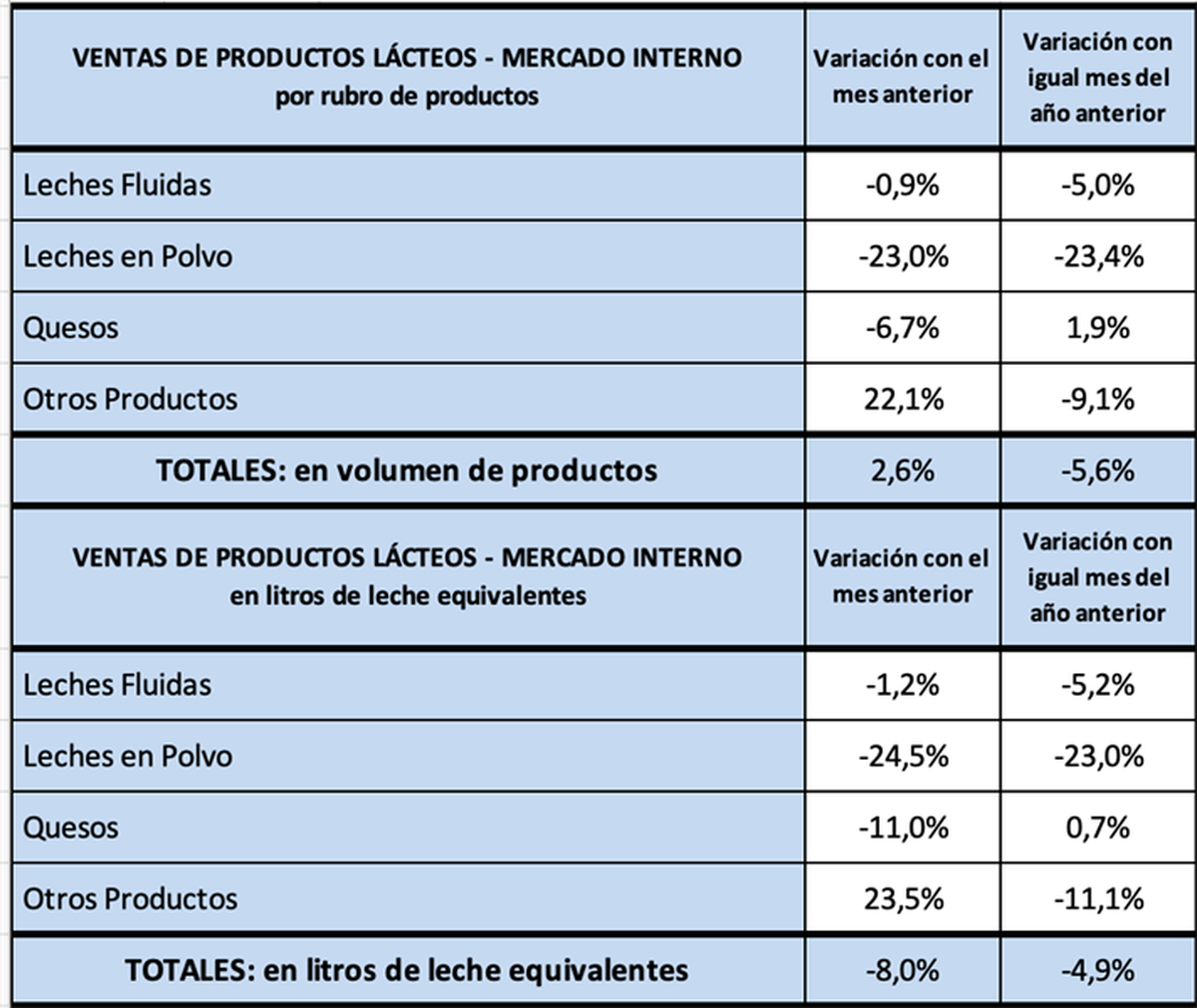 Pero en la comparación interanual (ene/26 vs ene/25) hubo una baja en volumen de productos del 5,6% y del 4,9% en litros de leche equivalentes.