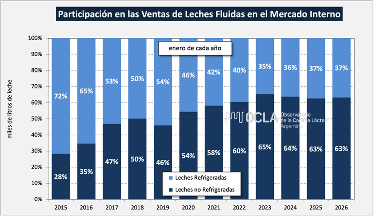 La OCLA recuerda que hubo un descenso en el total de leches fluidas (al menos las que captura la Resolución 230) que se viene dando en los últimos 10 años. Por otra parte, se evidencia que fueron creciendo en participación las leches no refrigeradas en detrimento de las leches refrigeradas.