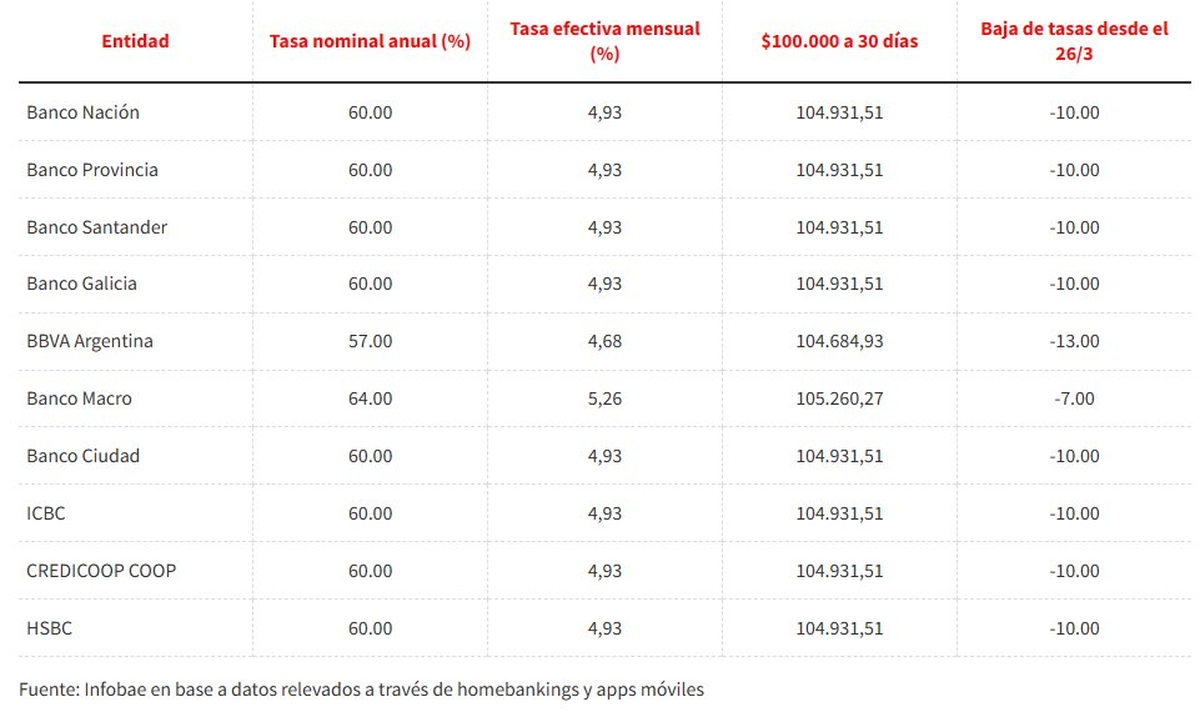 - Banco Nación: TNA 60% (TEA 4,93%)