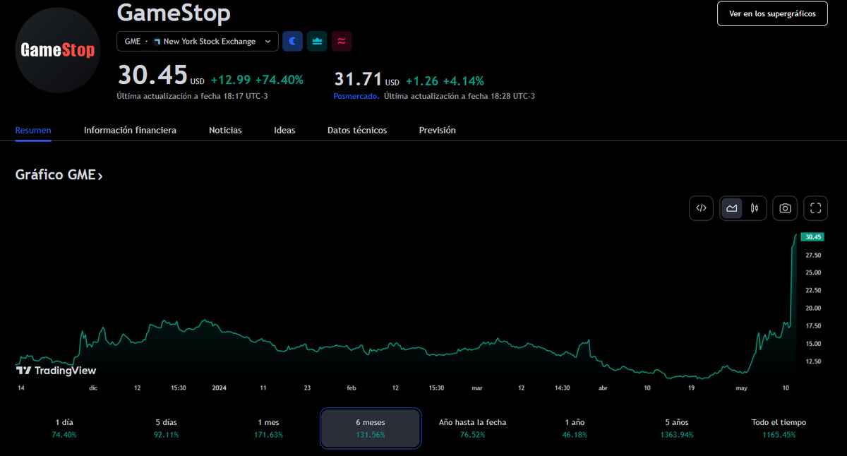 Las acciones de la cadena de videojuegos GameStop (GME) experimentaron hoy (13/5) un incremento cercano al 75%, luego de que "Roaring Kitty", un perfil asociado a un influencer financiero en redes sociales, volviera (luego de 3 años) a la actividad en X.