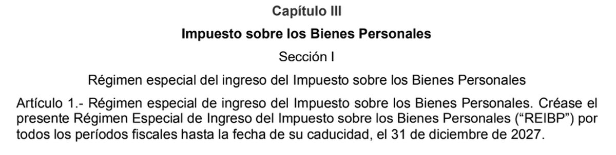 Se establece un Régimen Especial de Ingreso del Impuesto sobre los Bienes Personales (REIBP) que estará vigente hasta el 31 de diciembre de 2027. Los residentes fiscales en Argentina, según la Ley del Impuesto a las Ganancias, así como ciertas sociedades y fiduciarios, pueden optar por adherirse al REIBP. Incluso aquellos que, al 31 de diciembre de 2023, no son considerados residentes para este impuesto, pero lo fueron antes de esa fecha, pueden acceder a los beneficios de esta ley.