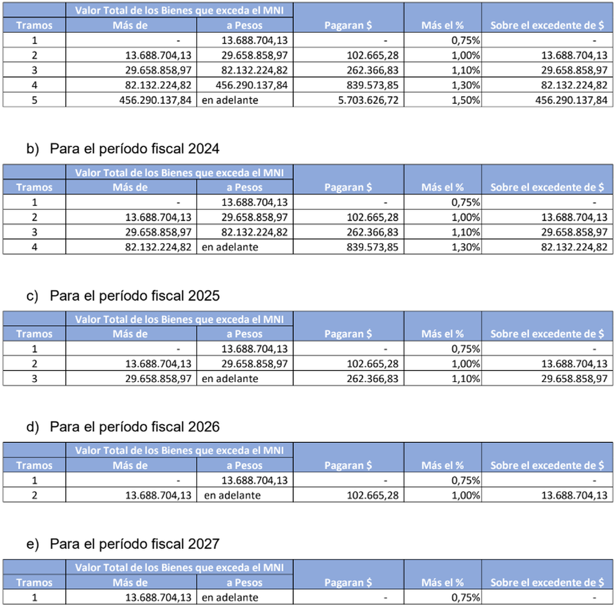 A partir del período fiscal 2024, los montos establecidos en las escalas deben ajustarse según lo dispuesto en el artículo agregado después del artículo 24 de esta ley. Los contribuyentes de este impuesto pueden considerar como pago a cuenta las sumas pagadas en el exterior por gravámenes similares, pero este crédito solo se aplica hasta el aumento de la obligación fiscal debido a la incorporación de bienes permanentemente situados en el exterior.