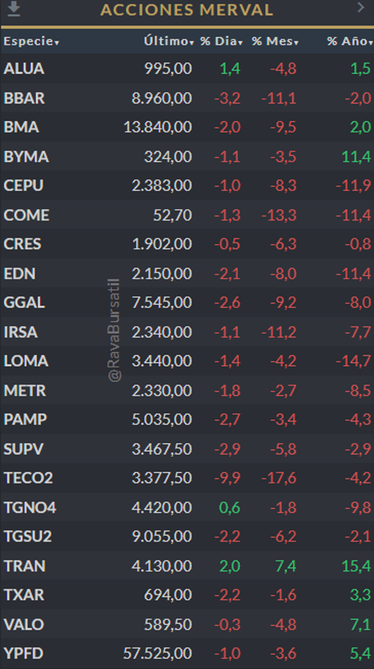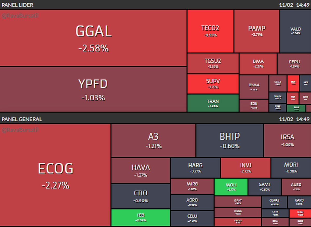 En energía y utilities también predominan números rojos. Pampa Energía baja 2,7%, YPF retrocede 1% y Telecom Argentina se desploma 9,9%, encabezando las pérdidas del panel líder. Solo Transener logra escapar con una suba de 2%, mientras TGN avanza 0,6%.