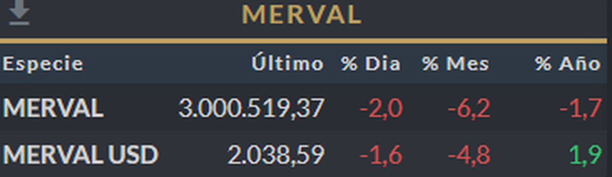 La discusión por la reforma laboral del Gobierno de Javier Milei impacta en tiempo real sobre los activos locales. Con el mercado todavía operando, el S&P Merval cae 2% hasta los 3.000.519 puntos, mientras que medido en dólares retrocede 1,6% y se ubica en 2.038 unidades.
