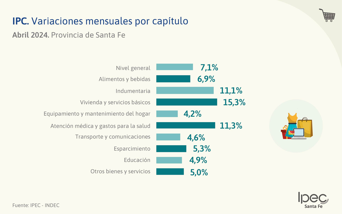 Con respecto a las especificaciones, dentro del 7,1%, la inflación estuvo impulsada por "Vivienda y servicios básicos" (+15,3%), seguido por "Indumentaria" (+11,6) y "Atención médica y gastos para la salud" (+11,3%). Por su parte, el rubro de "Alimentos y bebidas no alcohólicas" tuvo una suba del 6,9%, cifra por debajo del índice general.