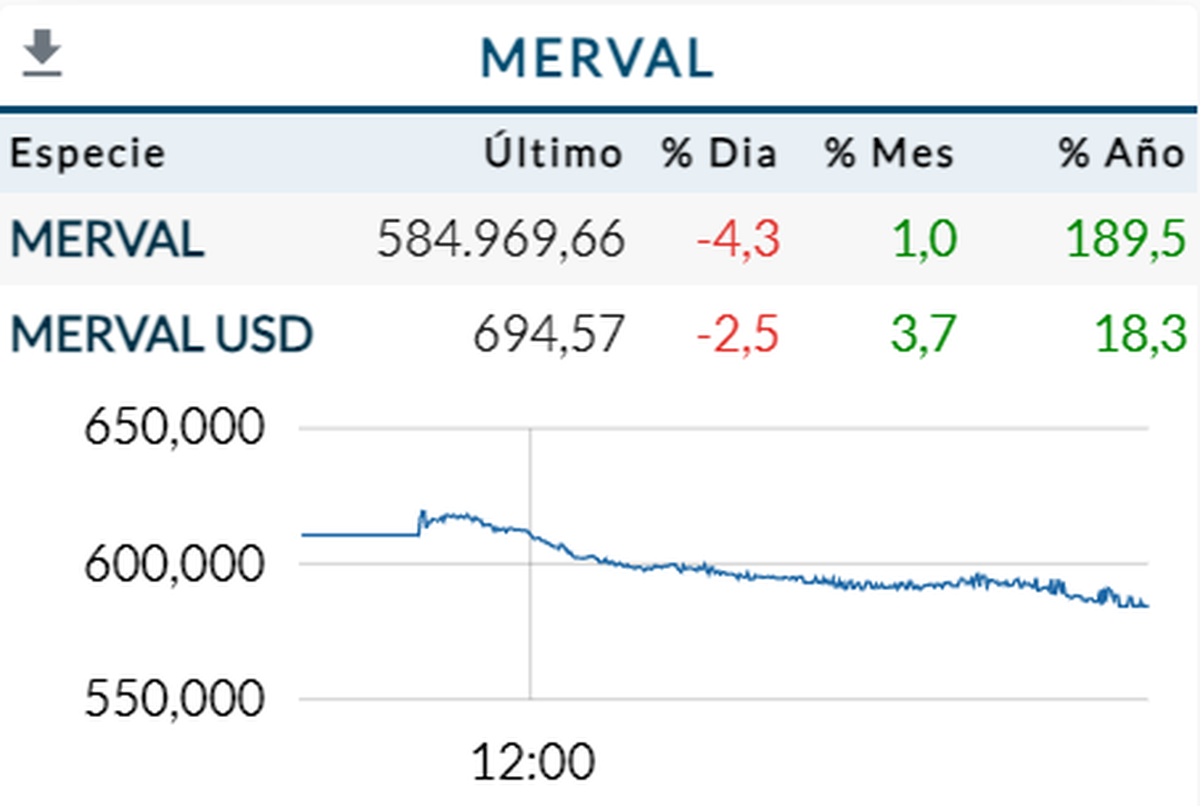 En cuanto al principal índice de acciones, el S&P Merval, terminó la jornada de hoy con una caída del 4,3%, a 584.969,66 puntos, en pesos, y del 2,5%, a US$ 694,57, en dólares.