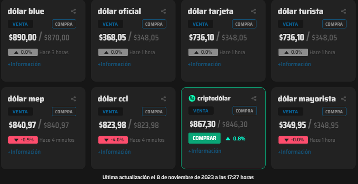 La divisa norteamericana no ha parado de caer desde los máximos alcanzados en la previa a las elecciones del 22/10. El dólar blue, luego de haber tocado los $1.200, cayó drásticamente por la tendencia bajista en la que entraron los dólares financieros (MEP y CCL) luego de que el ministro de economía, Sergio Massa, anunciara un tipo de cambio diferencial para todas las exportaciones (dólar exportador) que permite la liquidación del 70% al tipo de cambio oficial y el 30% restante al dólar CCL.