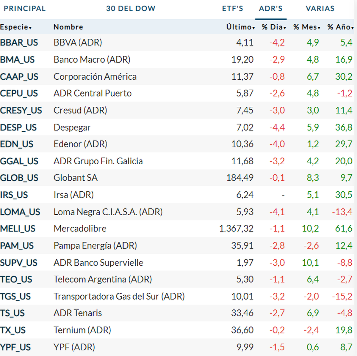 Por otro lado, las acciones argentinas que cotizan en Wall Street están experimentando descensos generalizados. Entre las que más bajaron se encuentran Despegar (-4,4%), BBVA (-4,2%), Loma Negra (-4,1%) y Edenor (-4%).