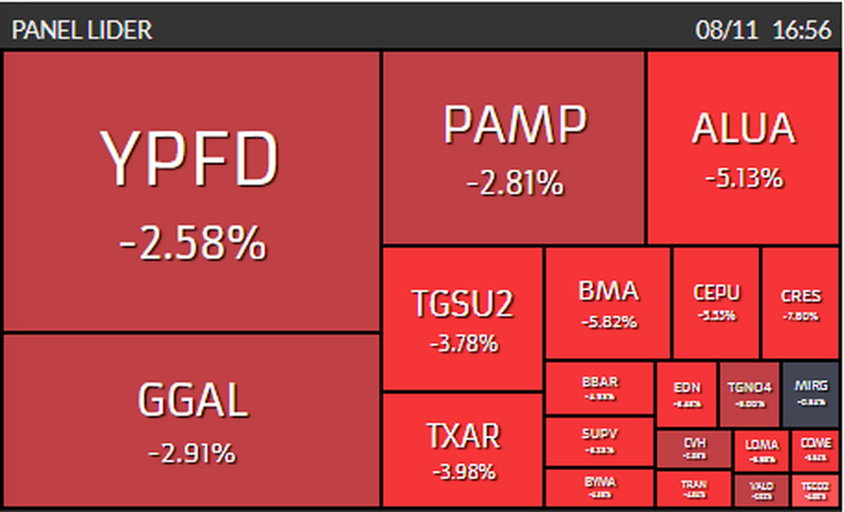 En este contexto, las acciones que lideraron las pérdidas, en el panel líder, de la Bolsa de Buenos Aires son Cresud (-7,8%), Banco Macro (-5,82%) y Aluar (-5,13%).