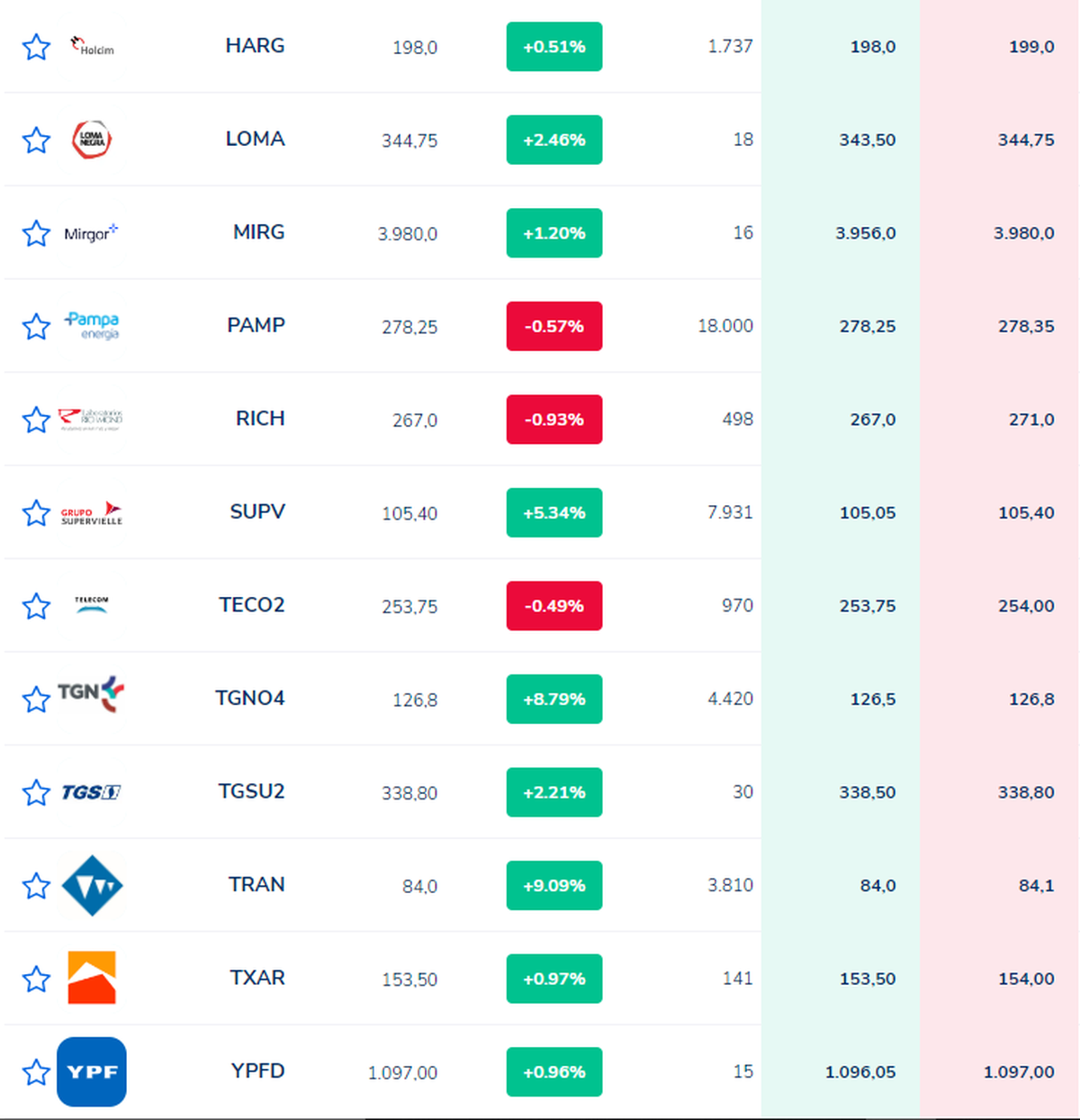 Las acciones con el mejor rendimiento fueron Transener -TRAN- con un 9,09%, Supervielle -SUPV- con un 5,34%, Comercial del Plata -COME- con +3,53% y Loma Negra -LOMA- con un +2,46%
