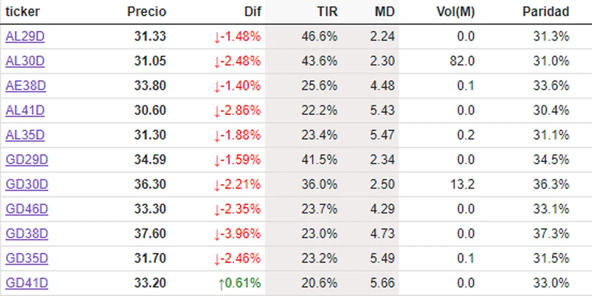 Los bonos en dólares llegan a caer hasta un 3,96%, mientras que el único que sube es el GD41D y lo hace con un 0,61%.