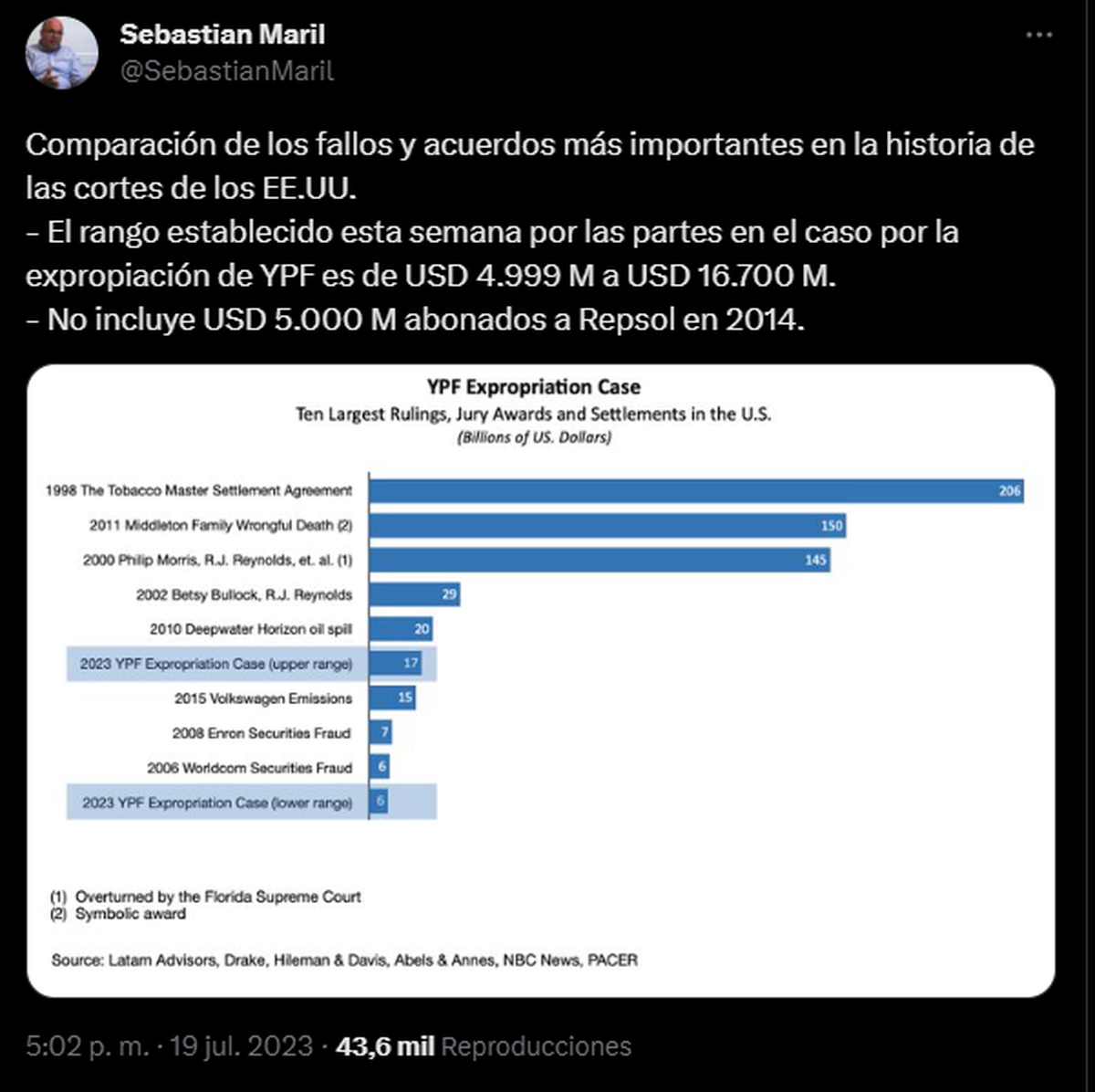 "La mejor evidencia de que es una tasa justa es que es la que la República acordó en casos similares, como cuando le pagó a Repsol por su expropiación 5.000 millones de dólares en bonos gubernamentales, incluida deuda con un interés compuesto superior al 8%". Esa fue la negociación que Axel Kicillof llevó adelante cuando era ministro de Economía.