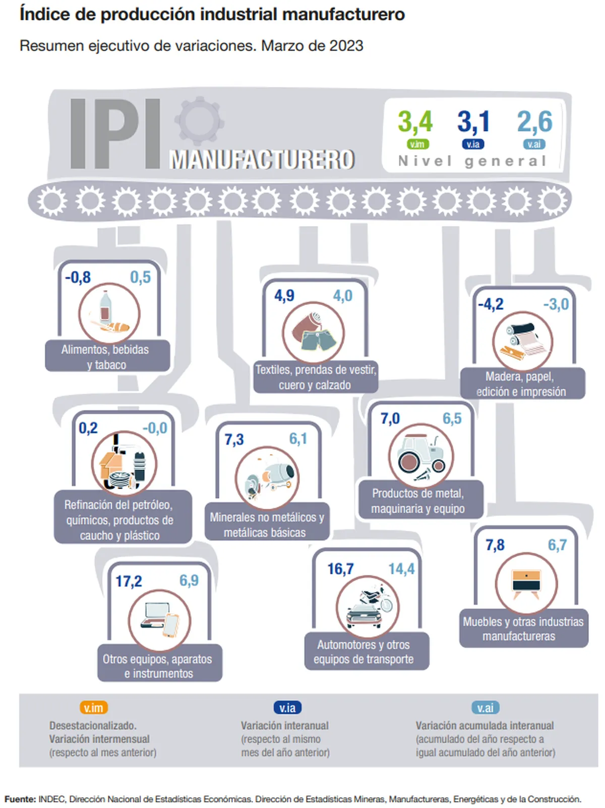 Esto mismo se evidenció en el artículo de Urgente24: Economía electoral: El primer trimestre no fue lo que los halcones esperaban, donde tenemos que, desde que comenzó el 2023, la producción industrial de la economía no ha parado de crecer, al punto de marcar el mejor 1° trimestre en 6 años. La producción industrial registró un aumento interanual del 2,6%, siendo marzo, específicamente, el mes donde la industria experimentó un crecimiento del 3,1% con respecto al mismo mes del 2022 y del 3,4% en comparación con febrero -sin tener en cuenta factores estacionales-. En consecuencia, este marzo ha sido el mes de mayor producción industrial desde al menos 2016, cuando se inició la serie de registros. Además, la actividad de la construcción también contribuyó al dinamismo económico de marzo, con un aumento del 1,2% en comparación con el mismo mes del 2022 y del 3,5% en relación con febrero.