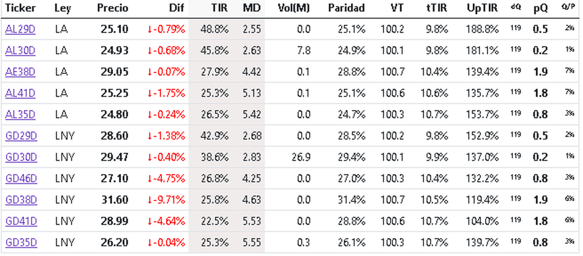 Por otro lado, los bonos en dólares cotizan todos a la baja y se negocian en el rango de los US$ 24,80 y US$ 31,60: