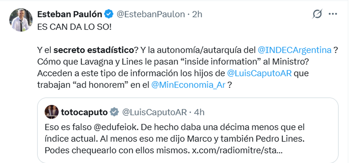 La publicación del dato de enero está prevista para el 10 de febrero, por lo que Caputo accedió a la información confidencial al menos 8 días antes. Y, para peor, la difundió públicamente, 'regalándole' un activo muy sensible a los operadores del mercado.