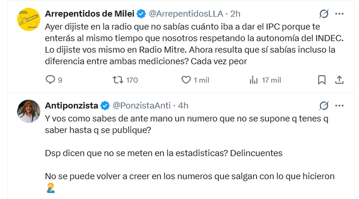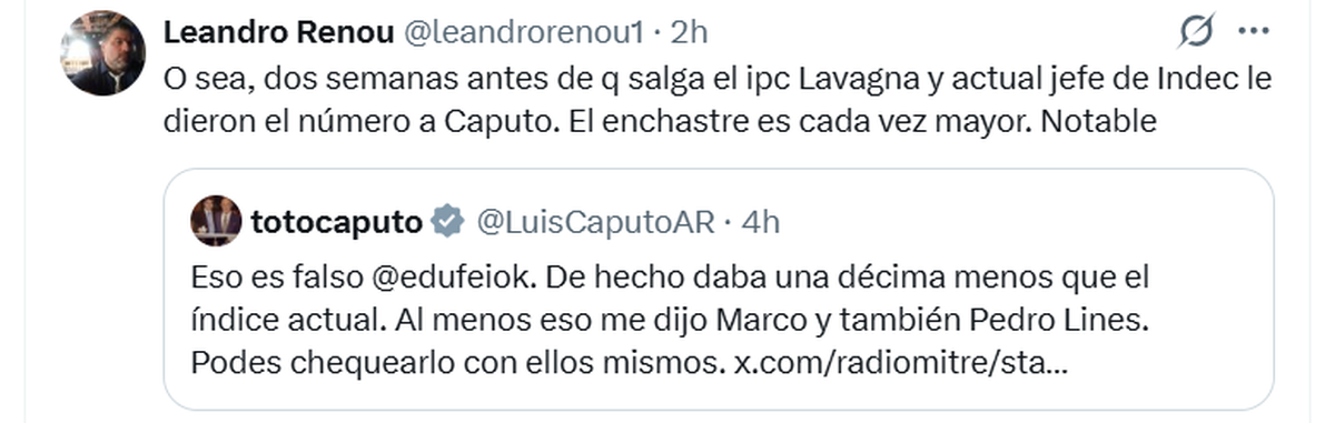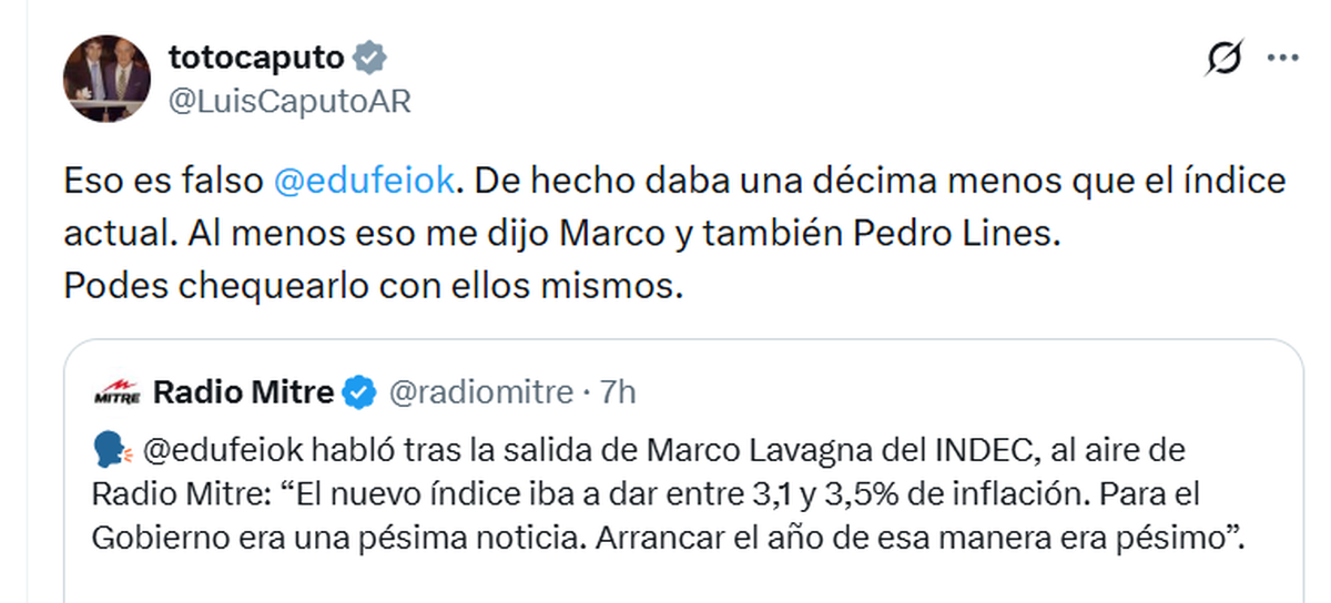 "Eso es falso @edufeiok. De hecho daba una décima menos que el índice actual. Al menos eso me dijo Marco y también Pedro Lines. Podes chequearlo con ellos mismos", le respondió en X el ministro a un posteo de Eduardo Feinmann, quien había asegurado que “el nuevo índice iba a dar entre 3,1 y 3,5% de inflación. Para el Gobierno era una pésima noticia. Arrancar el año de esa manera era pésimo”.