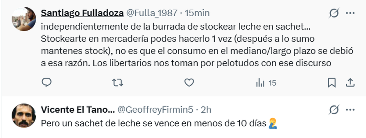 Lo más curioso de esta frase fue el ejemplo de los sachets de leche que, como cualquier persona sabe, es difícil de 'estockear' dado que necesitan heladera y tienen vencimiento corto...