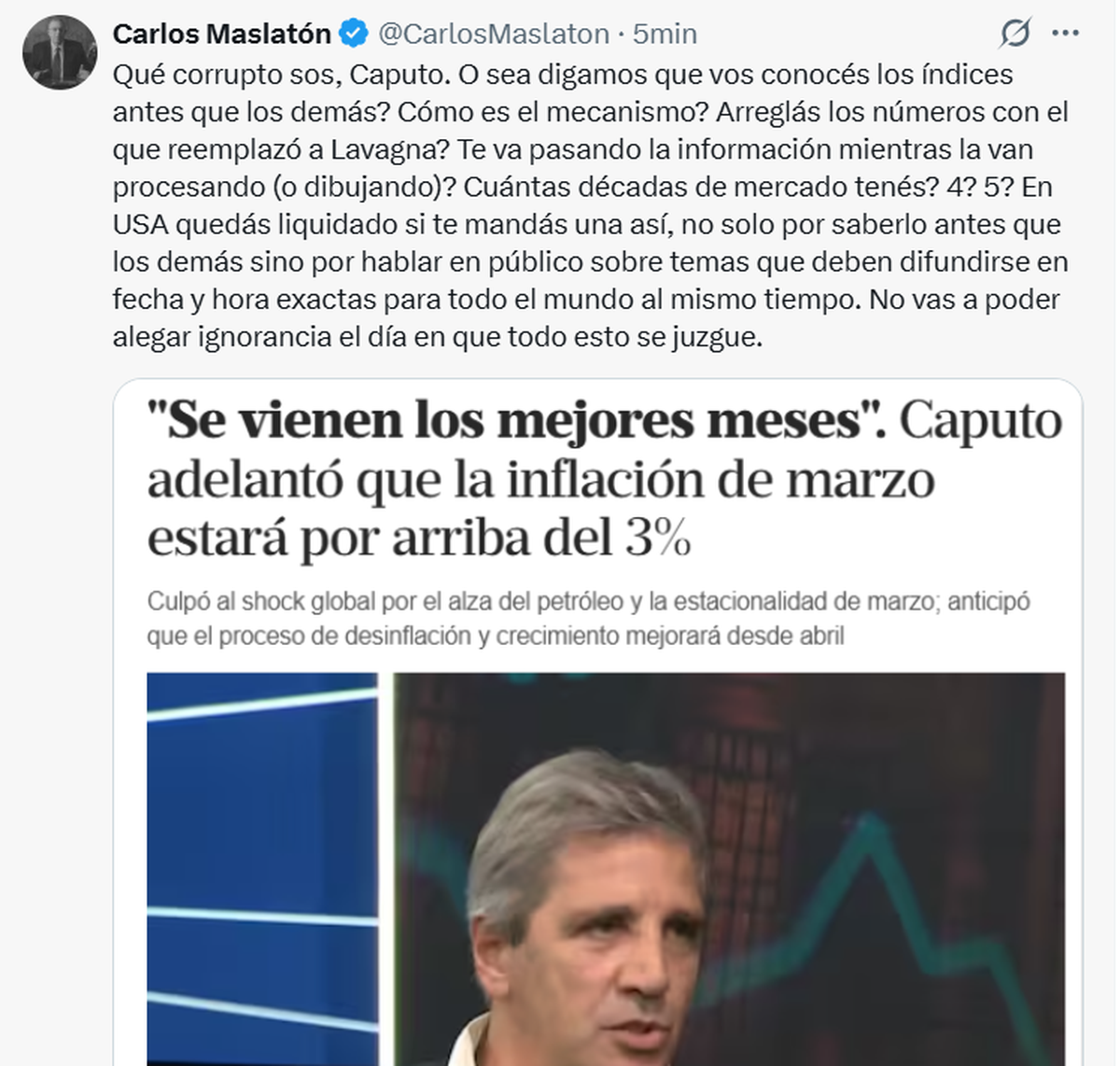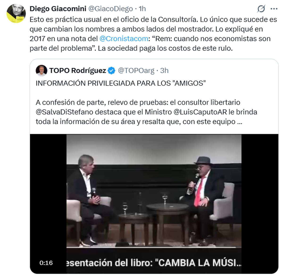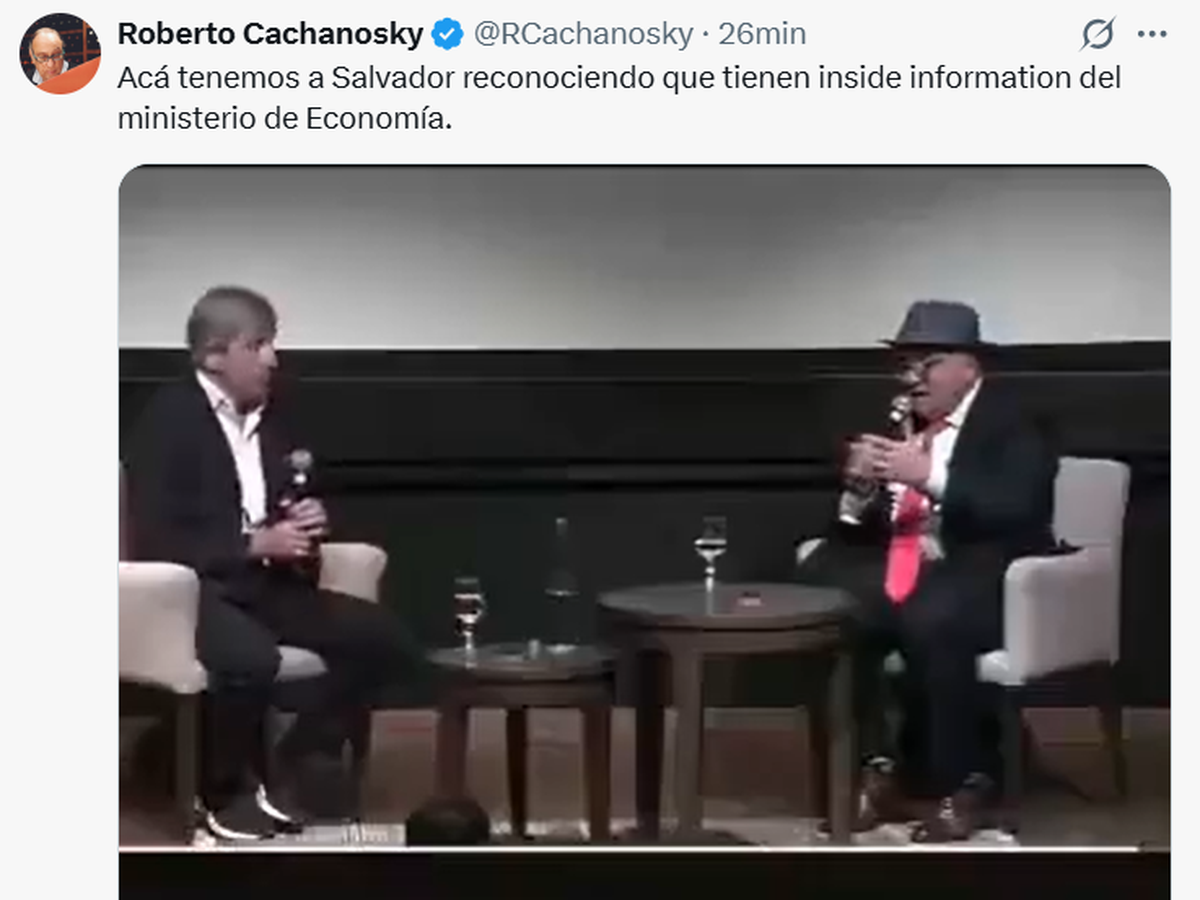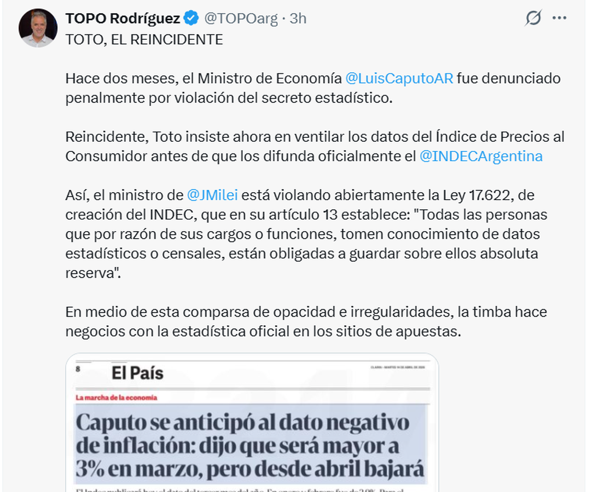 "A confesión de parte, relevo de pruebas: el consultor libertario SalvaDiStefano destaca que el ministro Luis Caputo le brinda toda la información de su área y resalta que, con este equipo económico, tiene 'todos los accesos a disposición'. Se entiende que, si el consultor usa como fuente frecuente y directa a los funcionarios, lo que recibe es información que no está publicada en el sitio oficial del Ministerio de Economía ni ha sido difundida a la prensa. El sincericidio de un privilegiado", cuestionó Alejandro 'Topo' Rodríguez, director del Instituto Consenso Federal.
