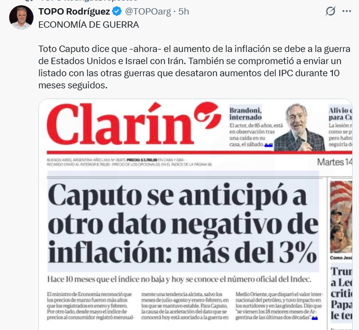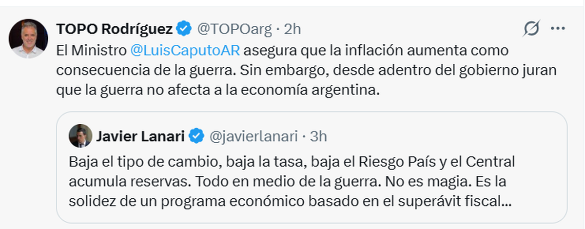 Otra de las definiciones de Caputo que fue cuestionada tiene que ver con el impacto de la guerra de USA e Israel contra Irán en la inflación argentina. El ministro de Economía aseguró que la suba del petróleo como consecuencia del conflicto bélico tendrá incidencia en el aumento de precios.