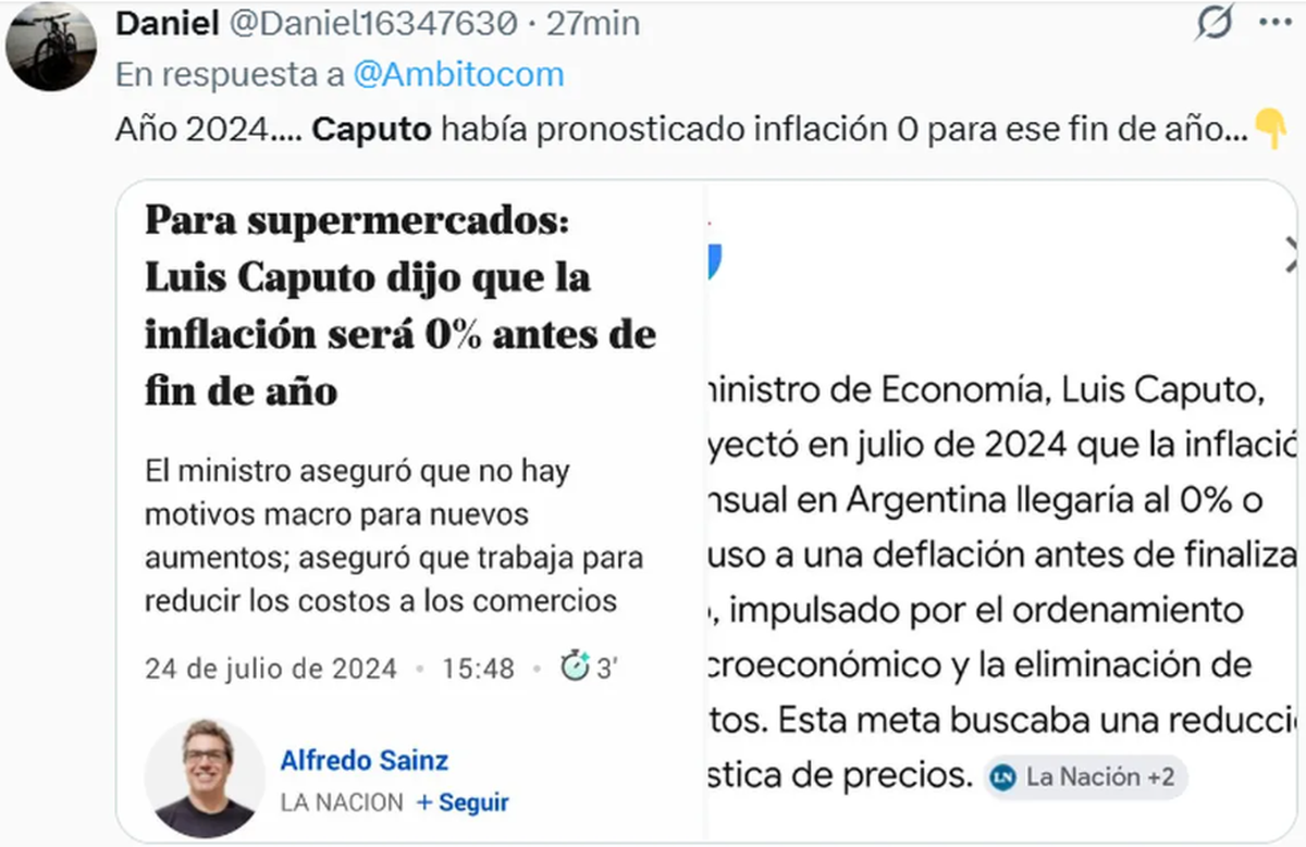 Anticipando el dato de inflación que dará esta tarde el INdEC, Luis Caputo admitió que superaría el 3% pero se apuró, otra vez, en hacer promesas que difícilmente pueda cumplir. Al menos, eso marcan los antecedentes: a mitad de 2024 prometía una inflación comenzando con "cero" para fin de ese año. Sin embargo, no sólo no sucedió, sino que el IPC no baja hace 9 meses (y hoy, probablemente, se sume un mes más).