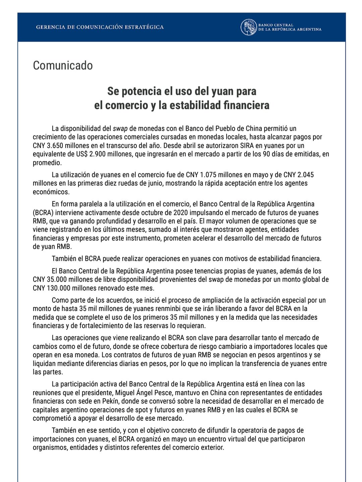 El Banco Central de la República Argentina posee tenencias propias de yuanes, además de los CNY 35.000 millones de libre disponibilidad provenientes del swap de monedas por un monto global de CNY 130.000 millones renovado este mes.