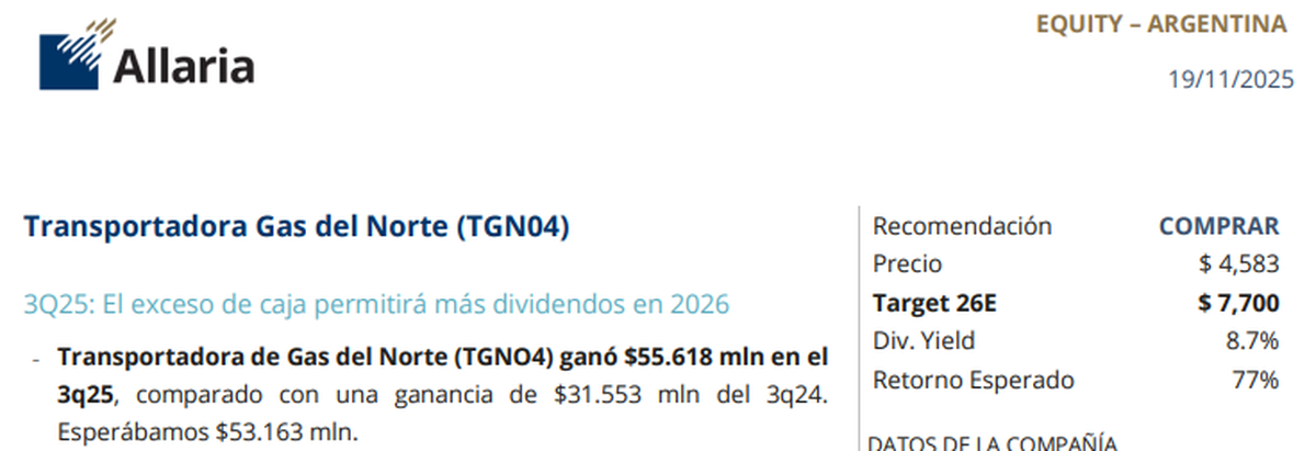Transportadora Gas del Norte exhibió un 3T25 consistente y alineado con la recuperación que comenzó tras la recomposición tarifaria de 2024. La compañía informó una ganancia de $55.618 millones, cifra que superó ampliamente los $31.553 millones del mismo período del año pasado. Allaria había anticipado $53.163 millones, lo que implica un leve desvío favorable .
