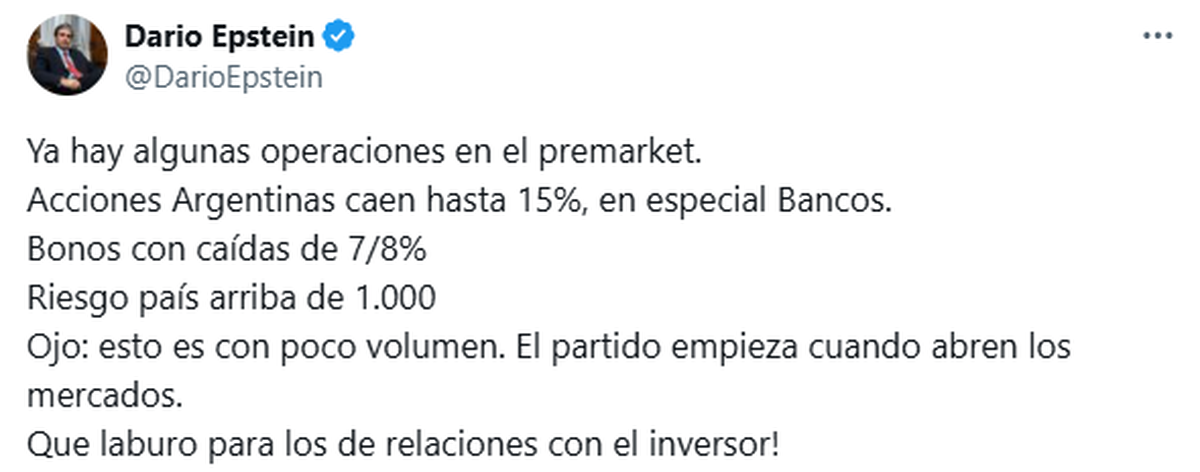 Los bonos arrancaban este lunes (8/9) con caídas de hasta el 7% mientras en el premarket de Wall Street el derrumbe de las acciones argentinas superaba el 15% pasadas las 8 hora de nuestro país.