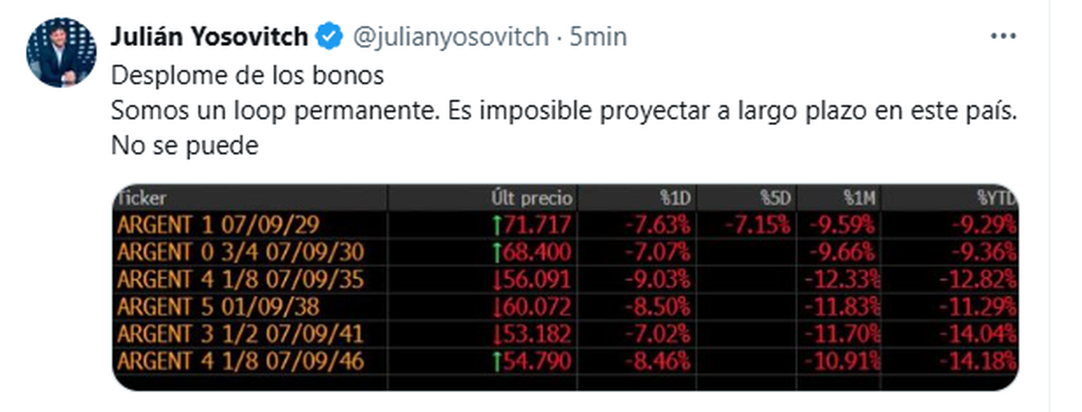 En cuanto a los bonos en dólares, las caídas oscilaban el 8% para el Global 2035 y del Global 2041 y el Global 2046.