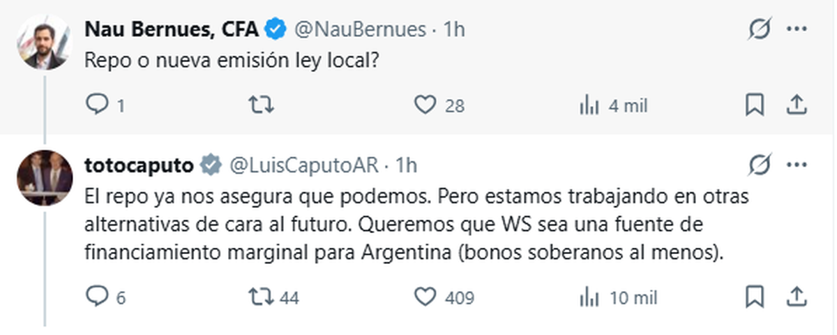 Acerca del REPO, Caputo le contestó a otro usuario que le preguntó en X si habría “Repo o nueva emisión ley local”: “El repo ya nos asegura que podemos. Pero estamos trabajando en otras alternativas de cara al futuro. Queremos que WS sea una fuente de financiamiento marginal para Argentina (bonos soberanos al menos)”.