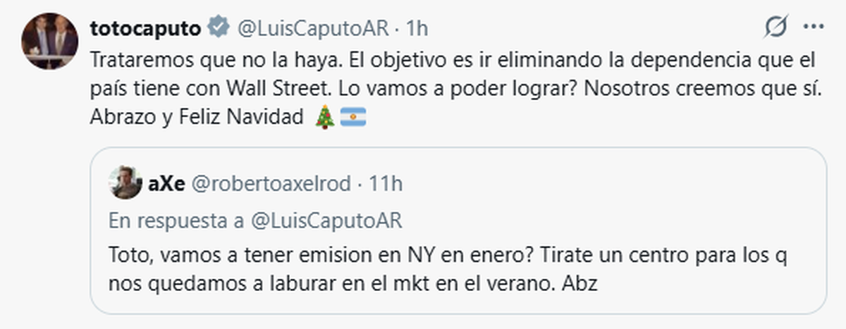 “Trataremos que no la haya. El objetivo es ir eliminando la dependencia que el país tiene con Wall Street. ¿Lo vamos a poder lograr? Nosotros creemos que sí. Abrazo y feliz Navidad", le respondió Luis Caputo a un usuario de la red social X este martes (23/12).