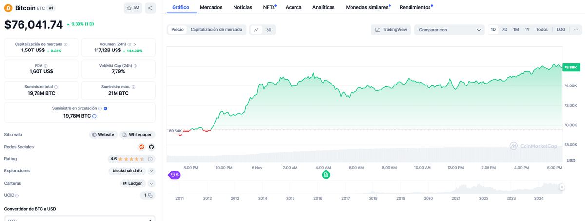 El nuevo récord de Bitcoin se consolidó con el triunfo de Donald Trump en la contienda presidencial, lo que impulsó su cotización hasta 75.317 dólares según datos de CoinMarketCap. Esta cifra superó el anterior máximo de 73.737 dólares, alcanzado el pasado 14 de marzo de 2024.