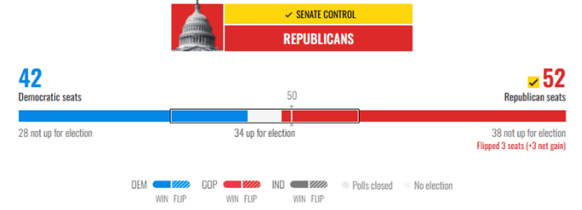 En paralelo, el Partido Republicano también se adjudicó el control del Senado, tras ganar en Ohio, y lidera en la Cámara de Representantes, lo que incrementa las probabilidades de un “Trump sweep” (control total del Congreso), respaldado por un 90% en los mercados de apuestas.