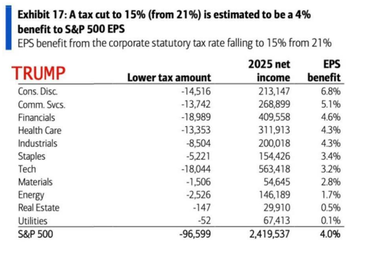 En las propias palabras del equipo de Allaria: "Considerando las proyecciones de Bank of America, en un gobierno de D. Trump y un Congreso que logre la aprobación de recorte de impuestos hasta el 15%, habría un impacto positivo en la mayoría de los sectores del S&P 500, destacándose C. Discrecional, uno de los sectores con mayor impulso históricamente en mandatos republicanos."
