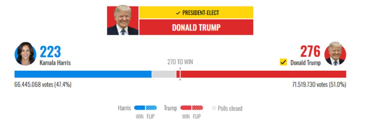 Las elecciones en Estados Unidos resultaron en una victoria clara de Donald Trump y el Partido Republicano, superando los 270 votos electorales necesarios y asegurando estados clave como Pensilvania, Georgia, Carolina del Norte y Wisconsin.